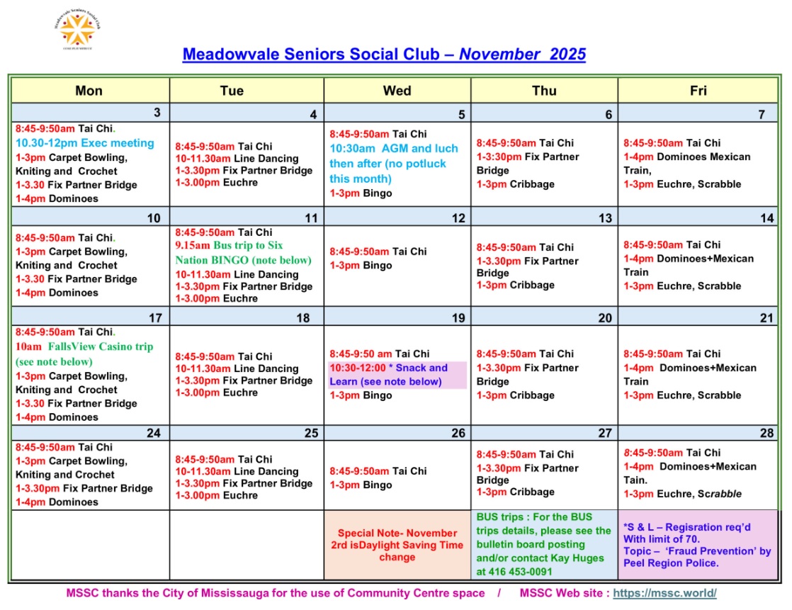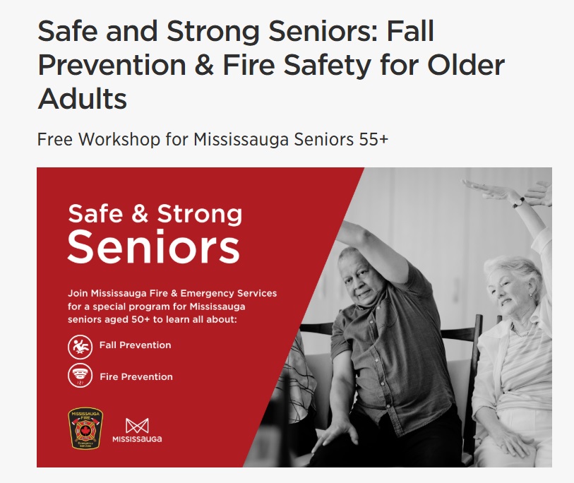 On Nov. 4 & 6 & 18, Safe and Strong Seniors: Fall Prevention & Fire Safety for Older Adults workshop comes to Meadowvale CC. Free Workshop for Mississauga Seniors 55+