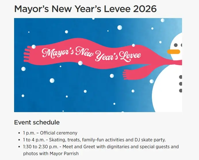 Jan. 11 Mayor’s New Year’s Levee comes to City Hall. Event includes skating, treats, family-fun activities and DJ skate party. Event time: 1 – 4 pm.